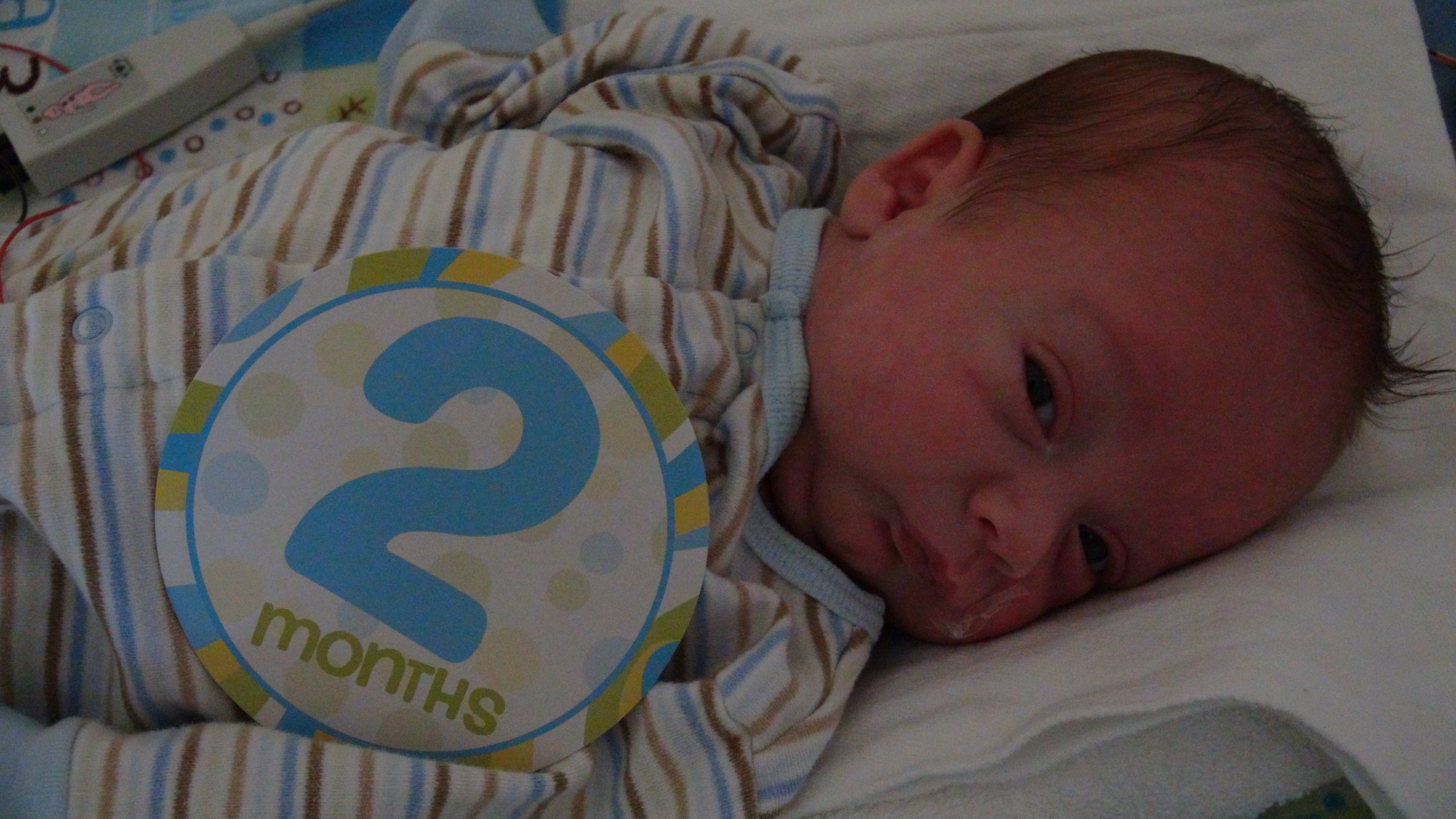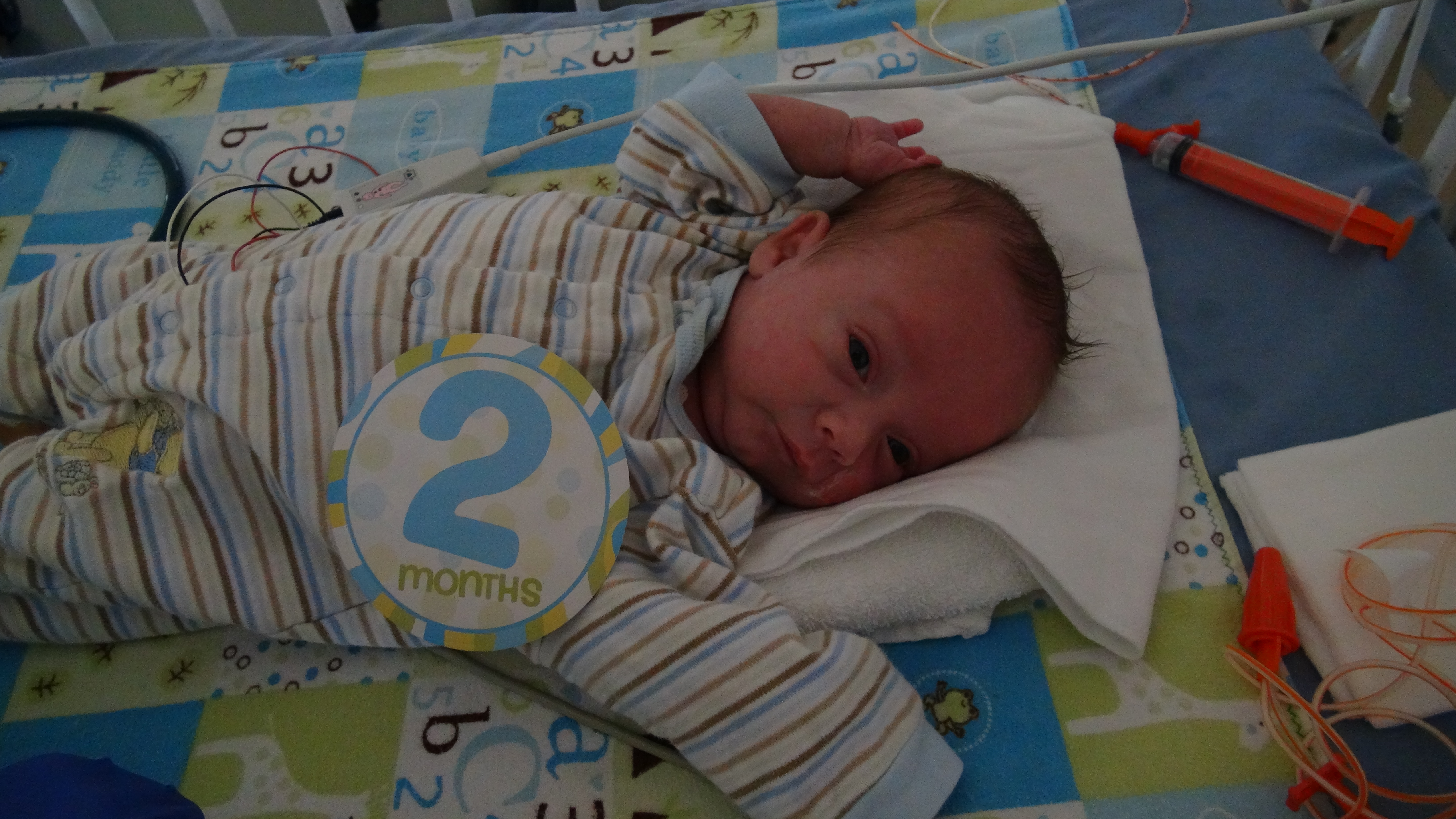 Theo celebrated his 2-month birthday with a celebratory surgery. He had his reanastomosis today where they reconnected his ileum, or the lowest portion of his small intestine. His surgery went very well and they are planning to extubate him in the next 24 hours. He had his spontaneous bowel perforation on day 3 of life, so we were very happy to say goodbye to the smelly ostomy bags today. Now, at 6lbs and 7oz this little boy is a fantastic eater and we have no doubt that once he is recovered from his procedure he is in the running to be the first or second one home.