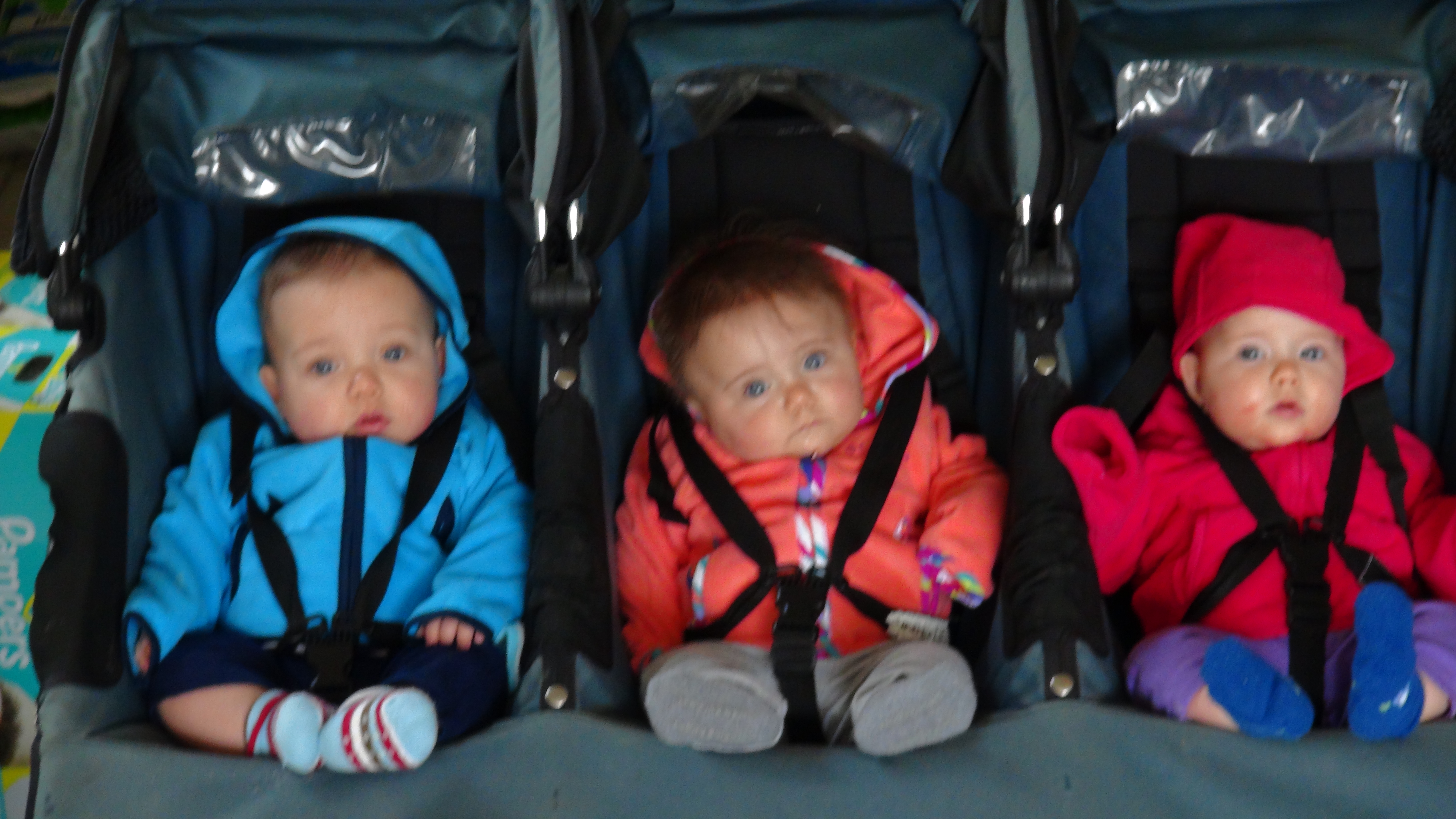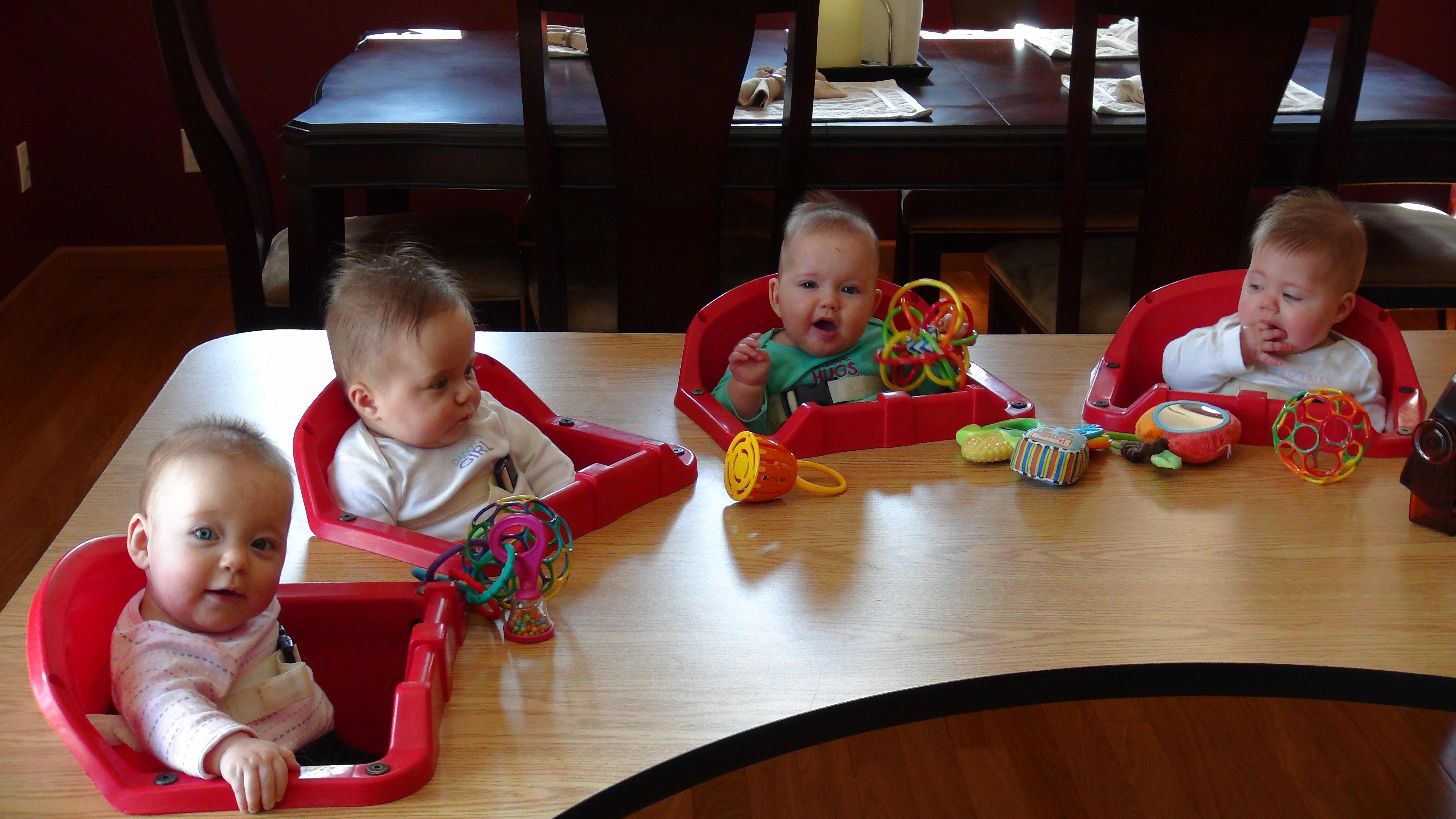 Another favorite past-time at 8 months is teething. Frank and I joke that getting teeth is a very inefficient process… 2 years of tears times five, well may be times seven. When all start moaning and groaning, hoping for those choppers, we gently ask them for results, and no more excuses. All are also working hard on learning how to crawl. They are all pros at the infamous Sphynx pose, as well as, rolling over. Theo is the closest to getting wheels. His efforts and dedication to learning to crawl are truly admirable. However, at this point he is easily frustrated and tends to opt for rolling like a log to get to and fro.