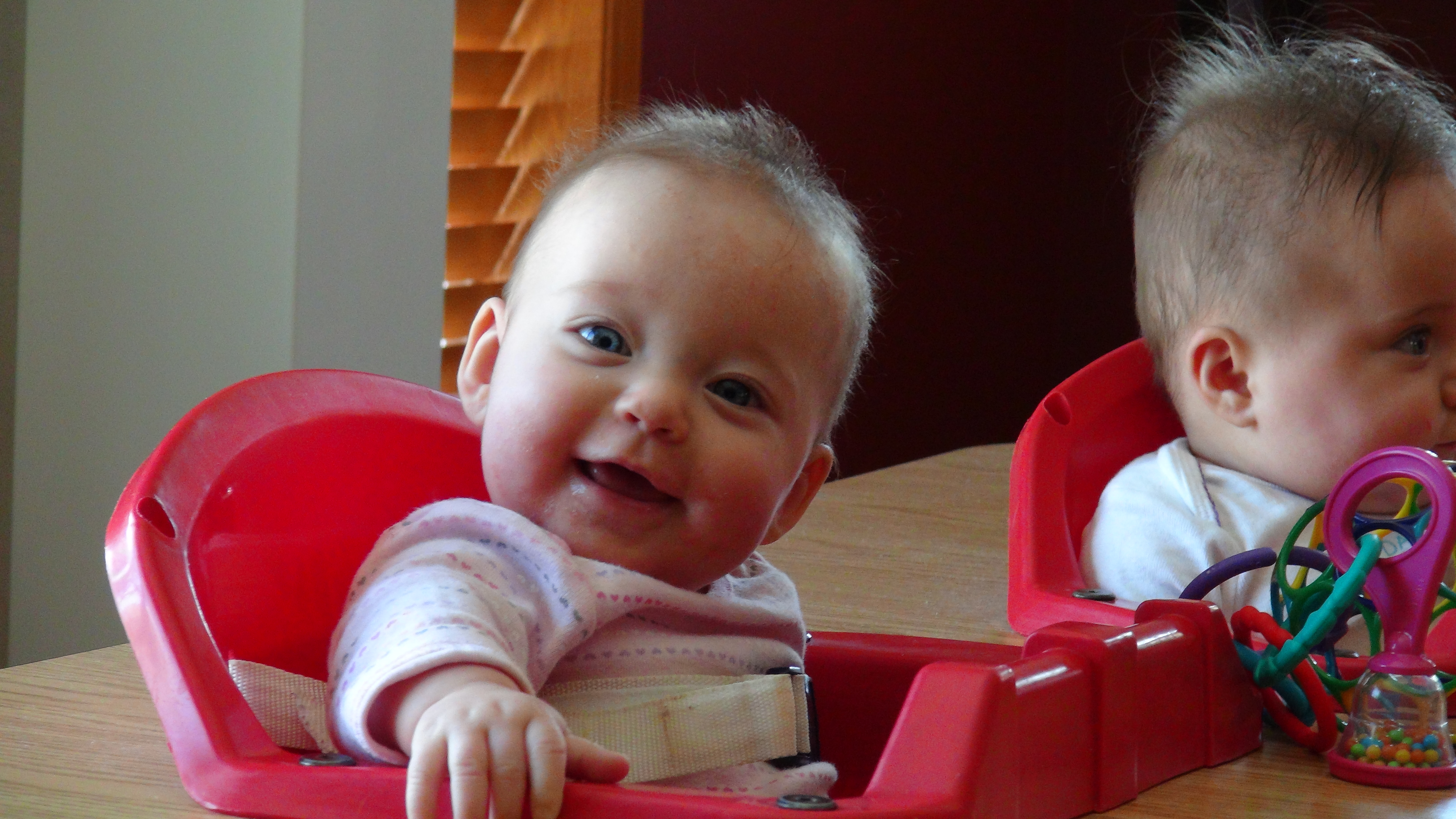 When the kids aren’t feasting at meals, they tend to be trying to gum each other or anything within 5 inches of their mouth, munch on their toes, or blow raspberries.